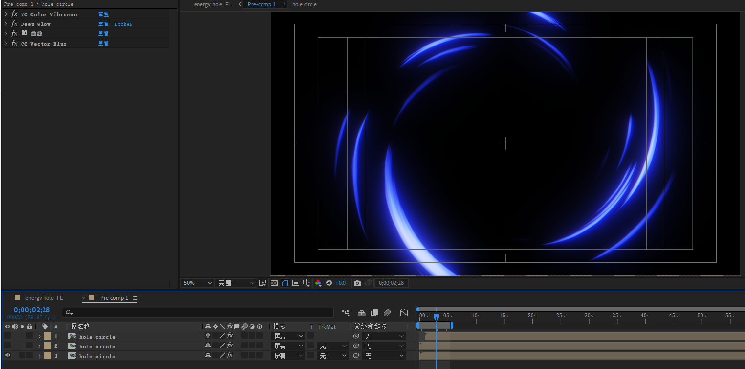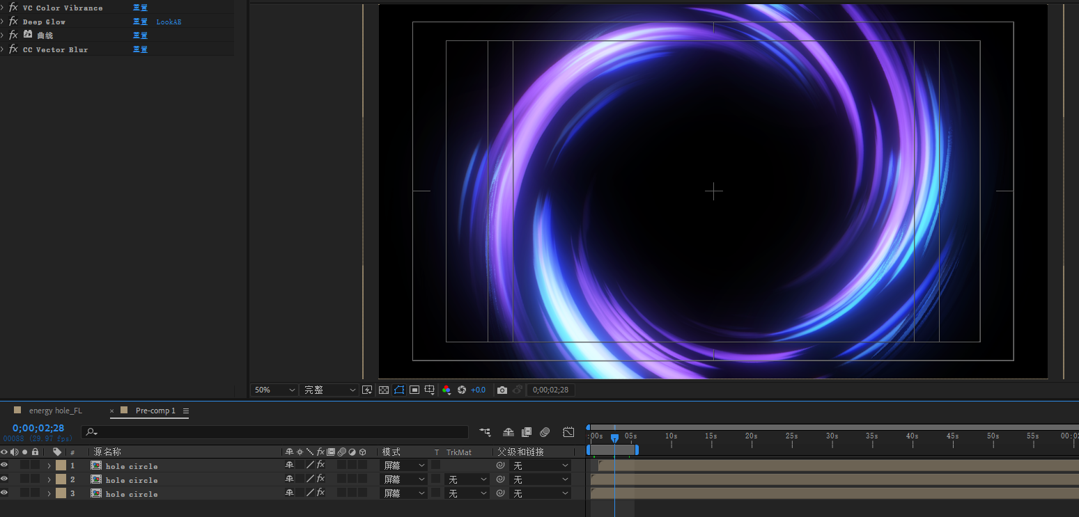 效果主要使用了CC ball action 、cc vactor blur、Deep Glow、圆形、分型杂色、湍流置换效果、 VC Color Vibrance 插件制作