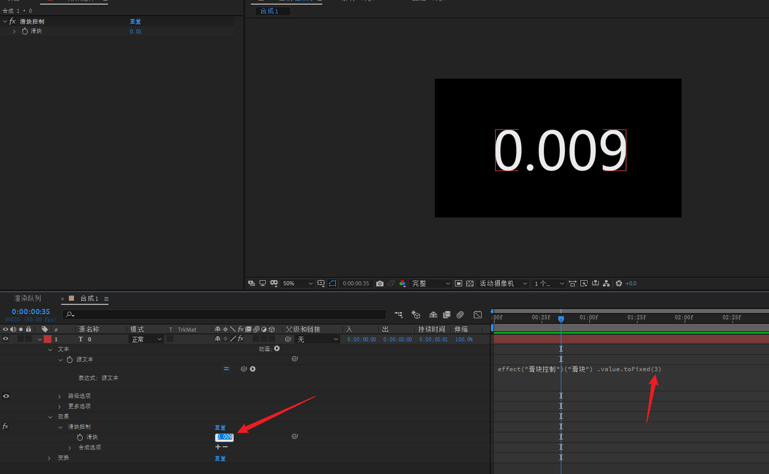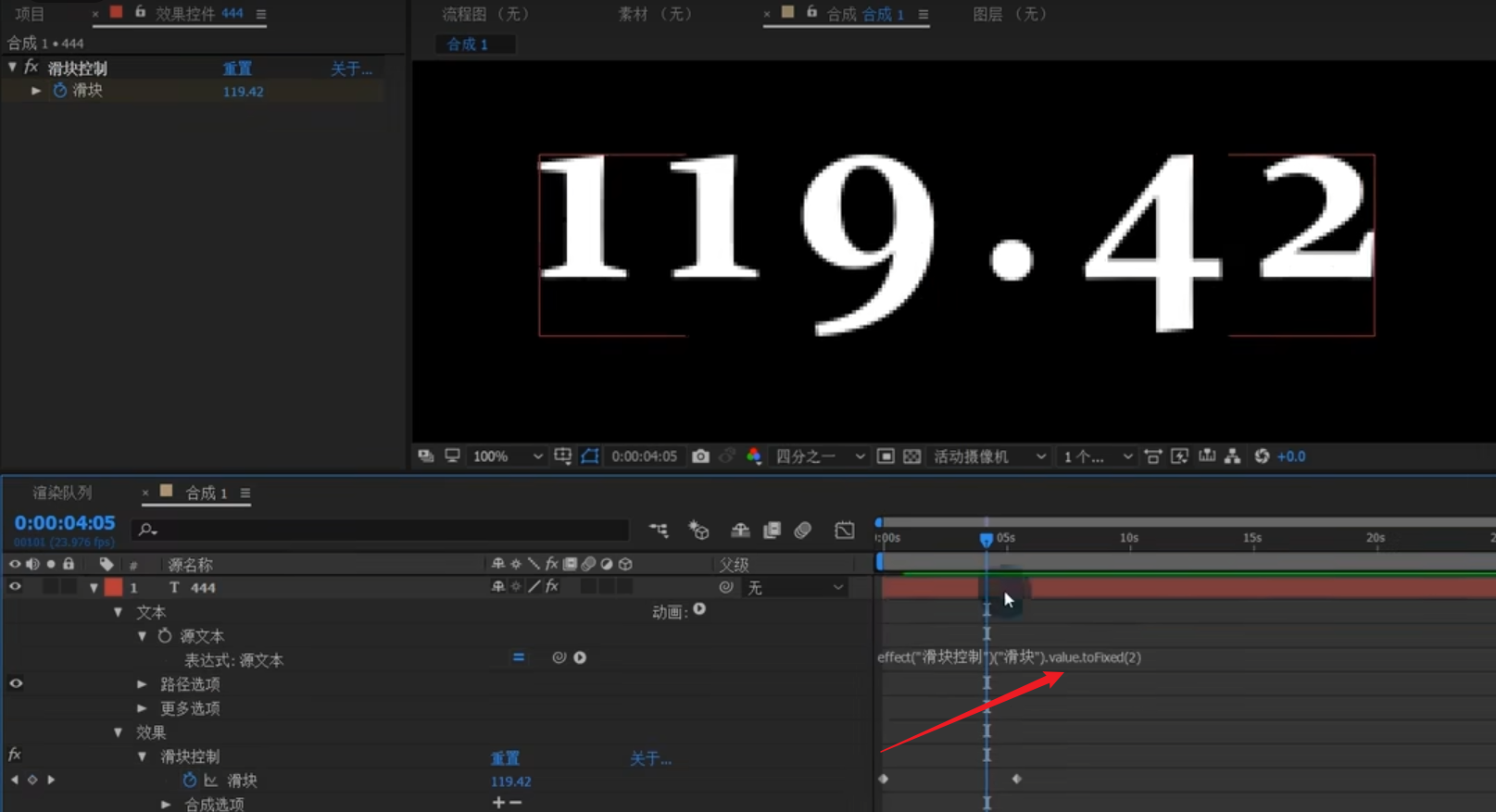 若是想以小数的形式做增长动画则需在滑块控制里也输入小数数值,小数点后是几位数便在文本表达式尾部括号填几位数