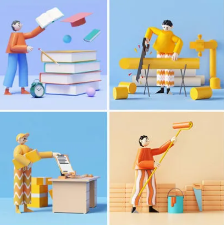 C4D卡通简约人物场景3D模型书籍办公家装场景插画工程源文件素材8款
