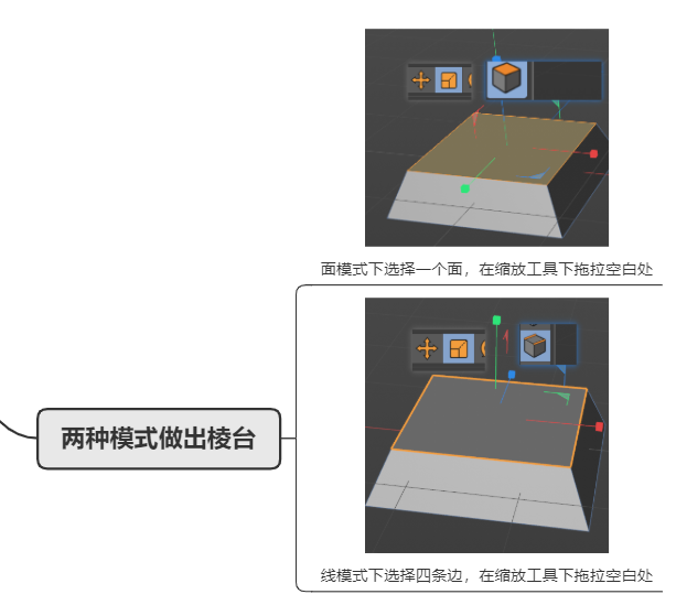 ①用两种方式做出棱台:可以在面模式下选择一个面,去缩放。还可以在线模式下,选择四条边使其围成一个面,然后去缩放。