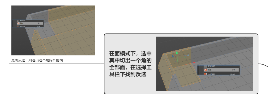 ②学习了关于反选的使用:在面模式下选中部分面,在选择工具栏中点反选后,则选中除此面外的面。