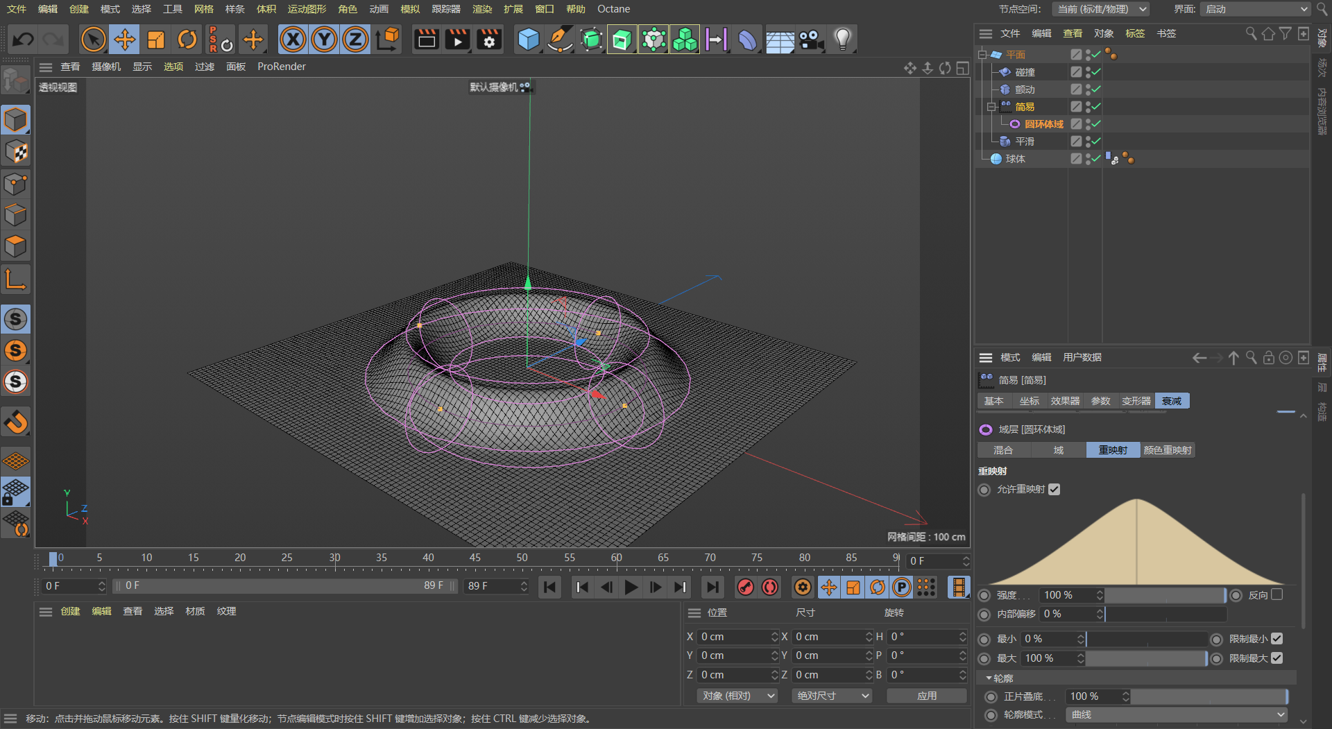 4️⃣ 接着在简易-参数中调整波动高度,然后添加圆环体域。圆环体域-重映射-内部偏移改为 0%,让波纹波峰变的平一点;轮廓改为曲线。