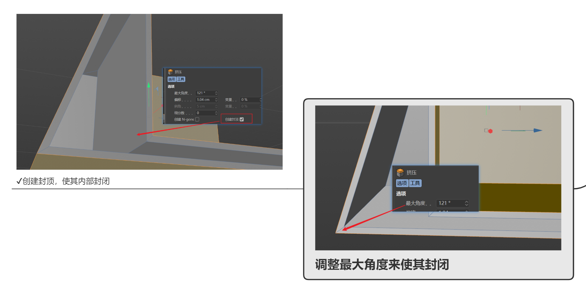 ②对于有厚度的角,要选择角内部和外部的线去进行倒角,否则会出现问题。