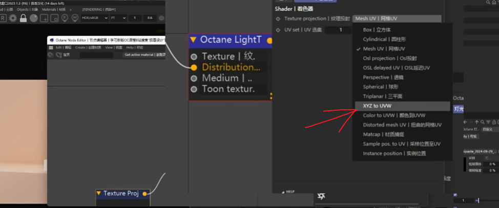 将光影贴图连接到灯光节点编辑器上并将投射模式更改为XYZ方向