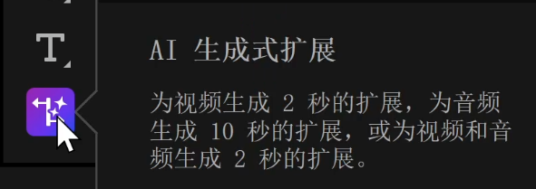 AI 生成式扩展可以智能的为视频生成 2 秒钟的额外视频内容,音频则可以直接生成 10 秒。