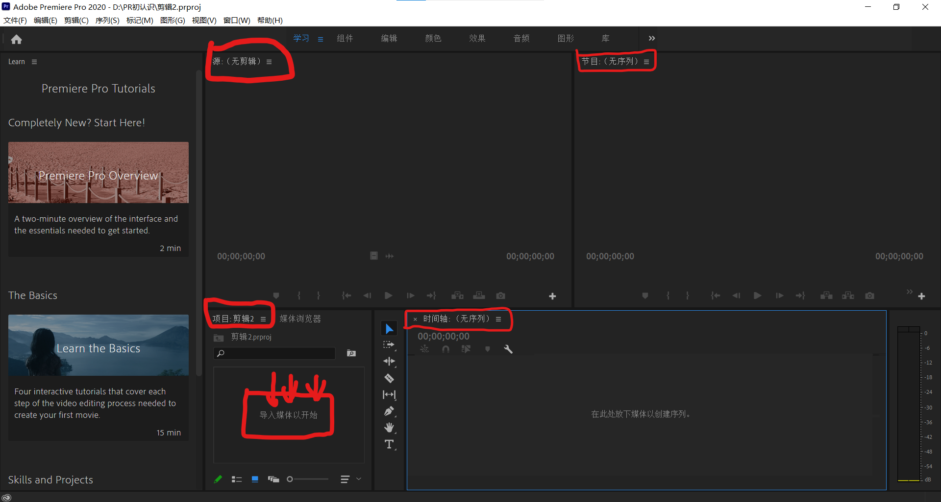 通过今天PR初认识的学习,我了解了1.安装:pr 2020,打开界面如下,点击新建项目,2.认识面板:项目“面板是开始,导入素材(双击面板选择;或者将文件拖入)源面板“主要用来对原素材的预览时间"面板是核心,可以在这编辑视频序列.3.序列:文件--新建序列【Ctrl+N】一引入后为了与标准席列匹配,可在时间面板右击"缩放为帧大小“不同的类型:高清/标清/超高清是1080p。4.导出文件:文件一导出一媒体【Ctrl+M】,输出格式等可以自己设置,也可以预设。记笔记,养成良好的自我学习习惯😊