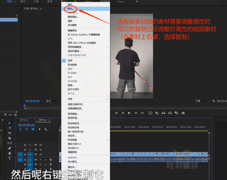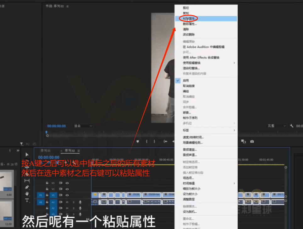 当剪辑视频时,有很多分段的素材需要调整属性,可以先复制已经调整好属性的视频素材,然后选中所有素材进行粘贴。