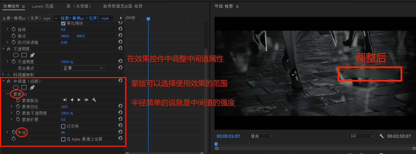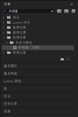 第二个是去除原片字幕可以用放大、高斯模糊、中间值的方法。中间值可以在效果中直接搜索,拖到素材上直接使用。