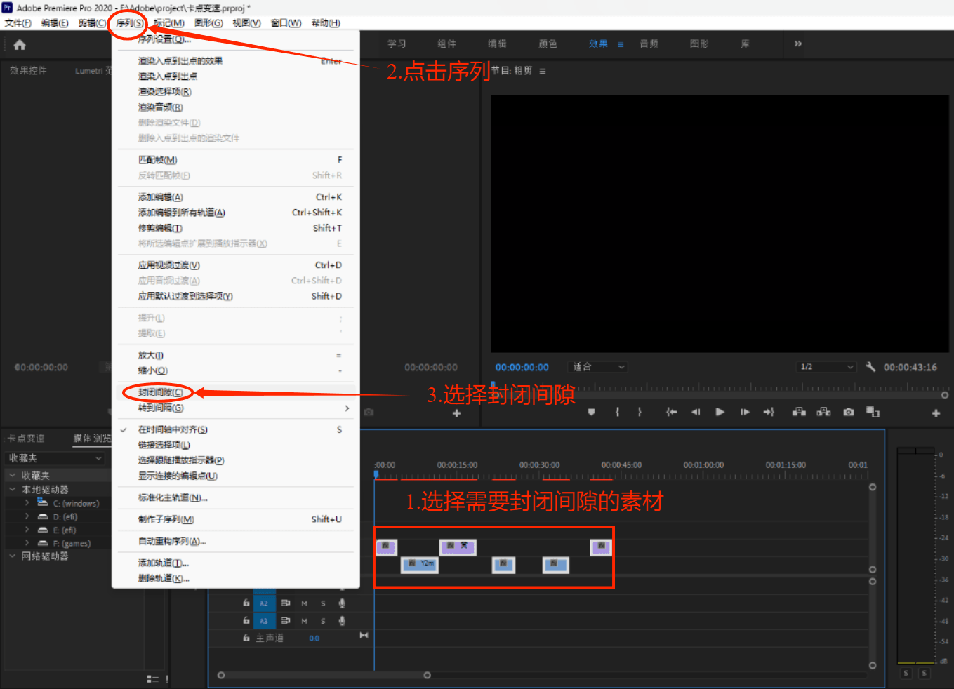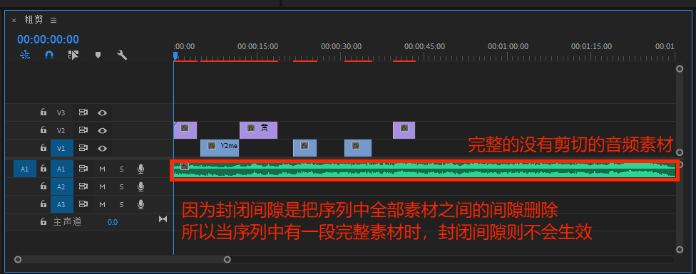 首先课上讲解了三个问题。第一个是删除大量片段之间的空隙所使用的功能是封闭间隙(Alt+s+c)。但封闭间隙有一个问题,如果这个序列中有一段完整的音频,封闭间隙就无法对切割开的视频素材生效。