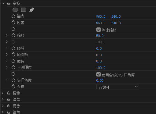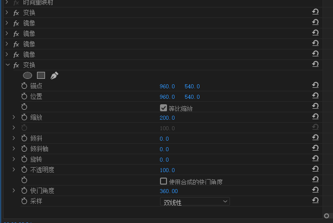 再次往调整图层上添加变换效果,并把下面的变换效果缩放调整为200,快门角度调整为360,这样拉镜前的必备工作就做好了,尝试拉一下位置的数值,就能看到有镜像的部分,拉完记得ctrl+z撤回