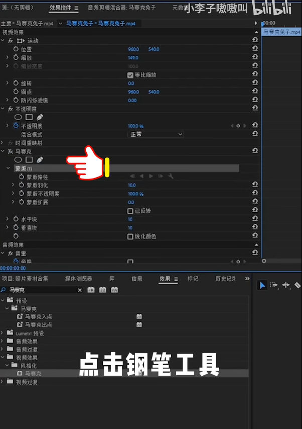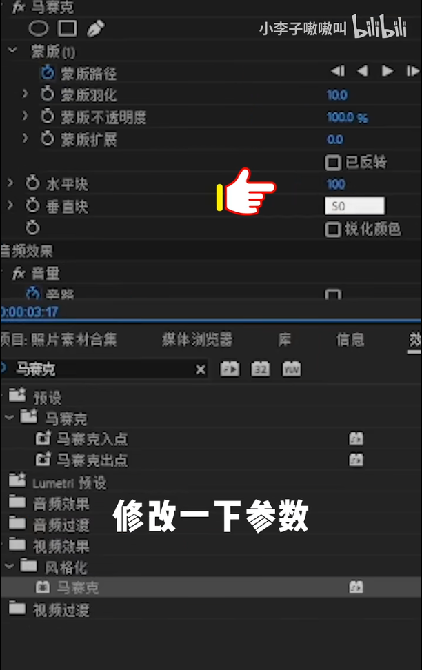 接着打开马赛克显示按钮调整一下水平块和垂直块的参数,然后点击蒙版路径的播放按钮就可以开始跟踪了,跟踪不准确的地方就手动k帧调整一下